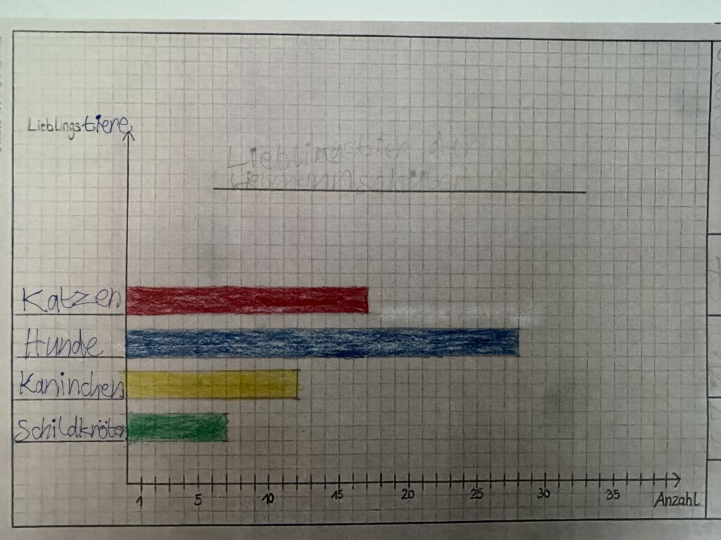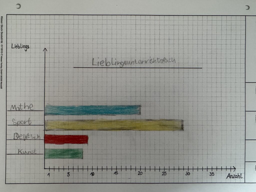 Im Mathematikunterricht haben wir, die Klasse 4 aus Hösbach, uns mit Tabellen und Diagrammen beschäftigt. Zuerst haben wir geübt, wie man Daten aus Tabellen abliest und Tabellen richtig ausfüllt und Informationen ordnet. Danach haben wir gelernt, wie man aus Tabellen Balken- und Säulendiagramme zeichnet.