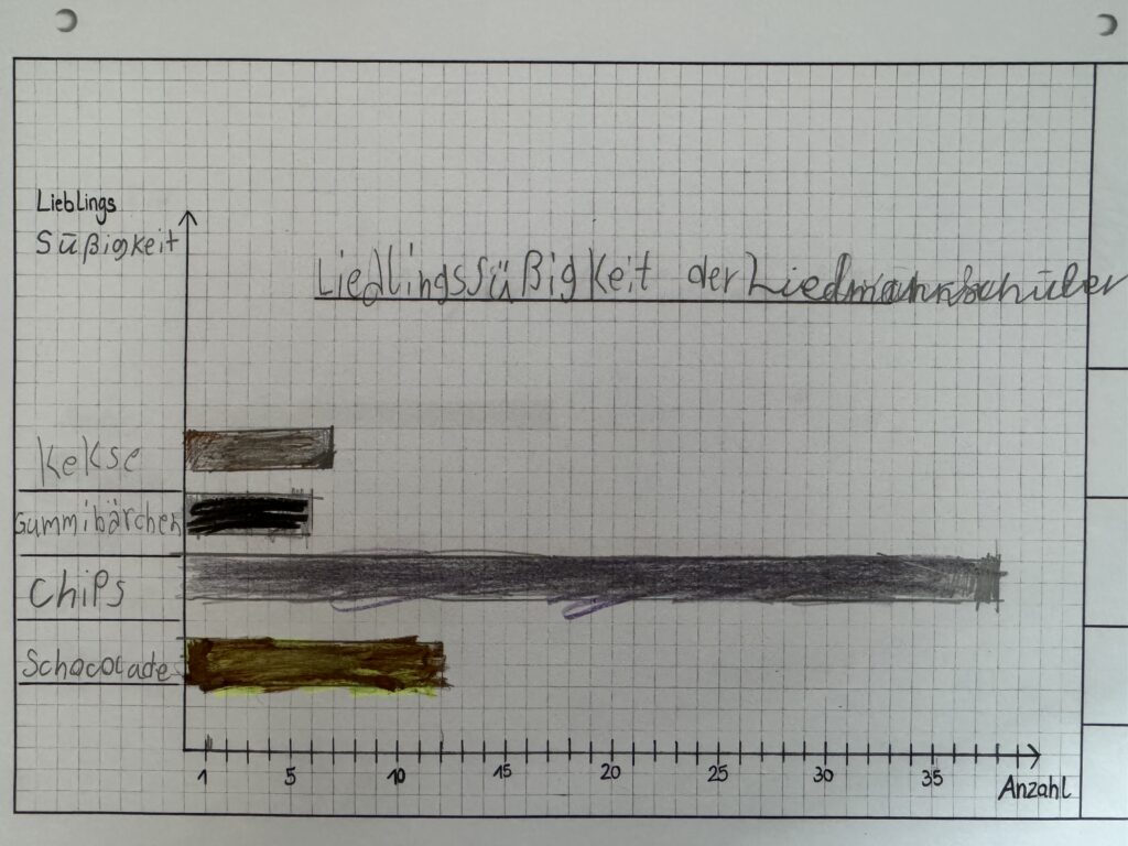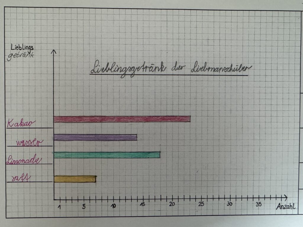 Anschließend haben wir die Ergebnisse gesammelt und wieder in Tabellen eingetragen. Aus diesen Tabellen haben wir Balkendiagramme erstellt. So konnten wir gut sehen, welche Antworten am häufigsten vorkamen. So haben wir herausgefunden, dass Nudeln das Lieblingsessen der Liebmannschüler ist und Kakao das Lieblingsgetränk. Das Lieblingsunterrichtsfach ist in Hösbach bei den Schulkindern Sport und Schwimmen und das Lieblingstier der Hund. In ihrer Freizeit beschäftigen sich die Liebmannschüler aus Hösbach am liebsten mit zocken und fernsehen und haben als Lieblingssüßigkeit Chips angegeben.